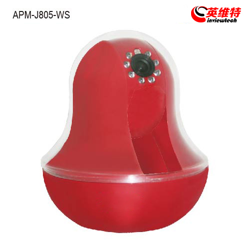 APM-J805-WS是英维特的一款私模产品,设计新颖,造型可爱独特,非常适合家里温馨的氛围。颜色分为黑色和红色,您可以根据需要选购。它配置1/4"彩色CMOS传感器和f: 3.6 mm,F:2.0 (红外镜头)(可选 6mm 镜头)镜头,最高分辨率为640 x 480像素,最低照度0.5Lux。APM-J805-WS安装有8个红外灯,夜视距离可达10米。双云台设计可以实现水平350度和垂直120度转动,支持15个预置点监控。